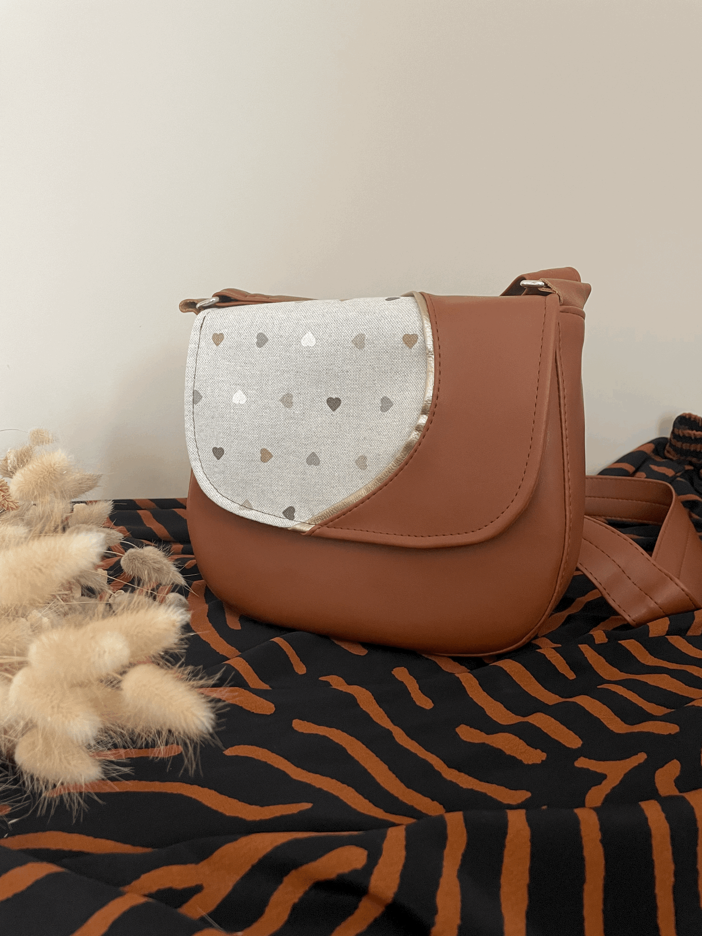 - Design unique : Le motif coeurs et le simili cuir noisette apporteront une note automnale et chic à votre garde-robe.